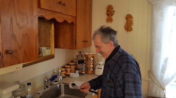 Rodrigue ne se prive pas pour gratter le fond de la rôtissoire pour manger le reste du cipaille.