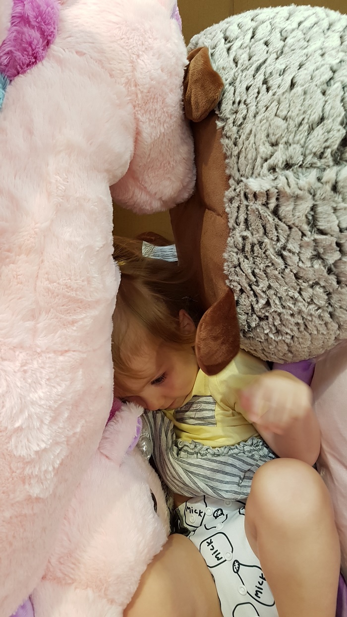 Charlotte amoureuse des toutous, dans la boîte contenant tous les peluches.