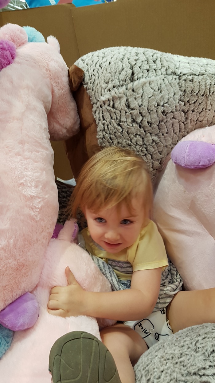 Charlotte amoureuse des toutous, dans la boîte contenant tous les peluches.