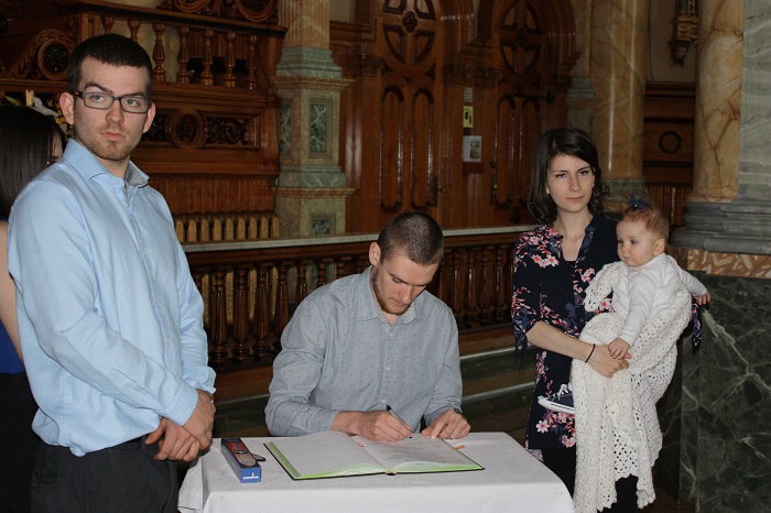 Baptême de Charlotte, fille de Jean-Clément Martel et de Camille Babineau. Le parrain est Gabriel Babineau (frère de Camille) et la marainne est Audrey Lepage (amie de Camille).