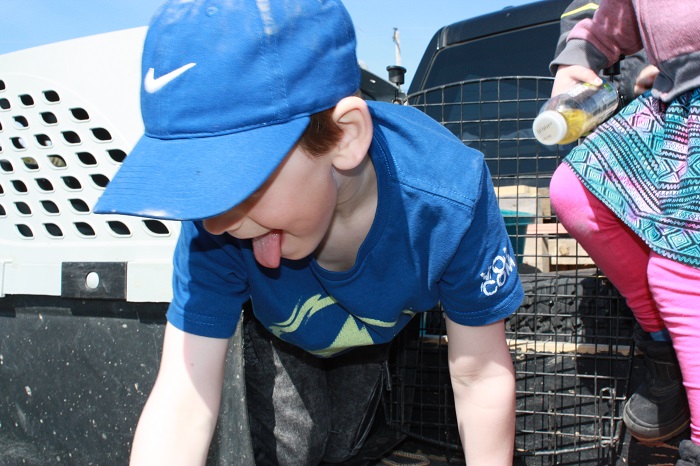 Réception après le baptême à la salle de la Fromagerie des Basques. Logan qui imite son chien.