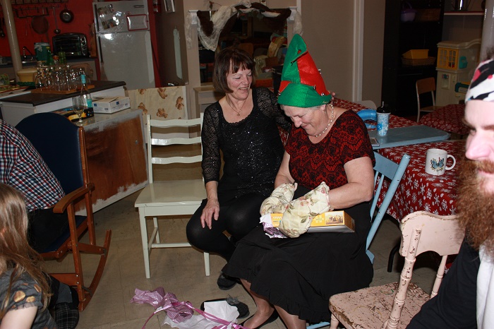 Noël à la garderie chez Martine, ouverture d'un cadeau avec des mitaines de four.