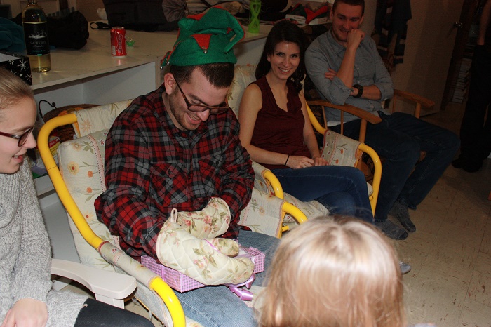 Noël à la garderie chez Martine, ouverture d'un cadeau avec des mitaines de four.