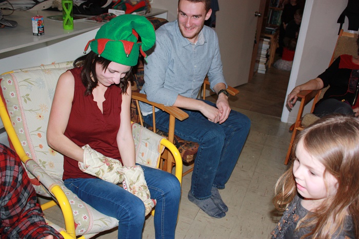Noël à la garderie chez Martine, ouverture d'un cadeau avec des mitaines de four.