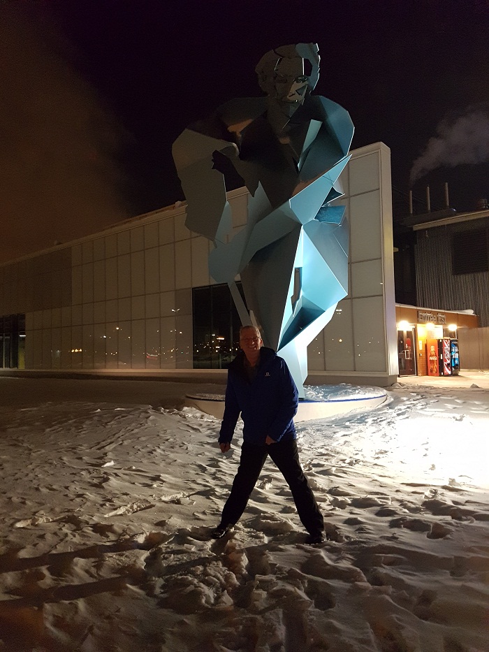 Devant la sculture de Jean Béliveau.