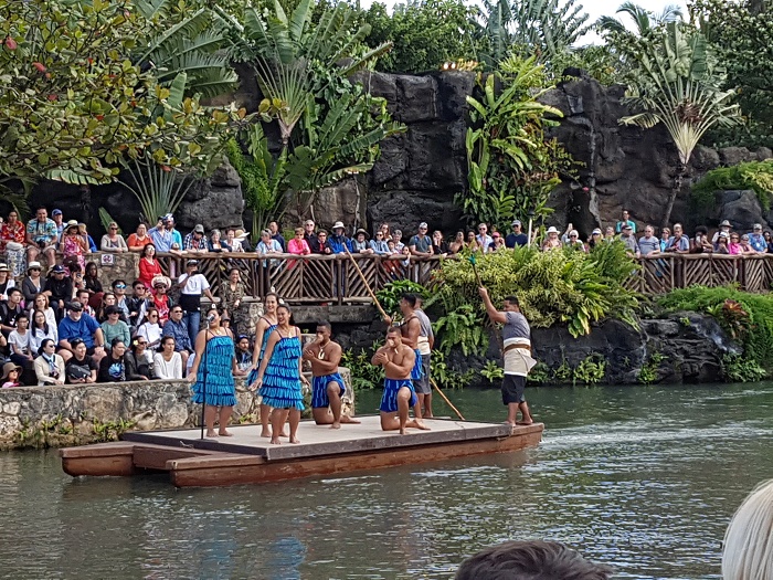 Le Centre culturel polynésien est un parc thématique polynésien et un musée vivant situé à Laie, sur la rive nord d'Oahu, à Hawaii. Samuel, Liv et Maxime sont dans la foulle en arrière. |
