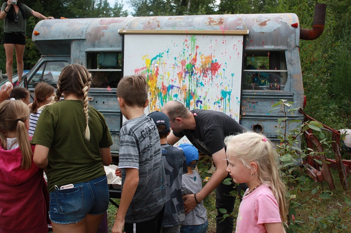 On participe à la lancée des oeufs remplis de peinture pour produire une toile coloriée.