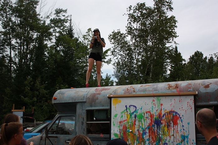 On participe à la lancée des oeufs remplis de peinture pour produire une toile coloriée.
