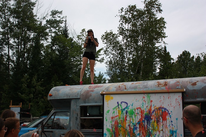 On participe à la lancée des oeufs remplis de peinture pour produire une toile coloriée.